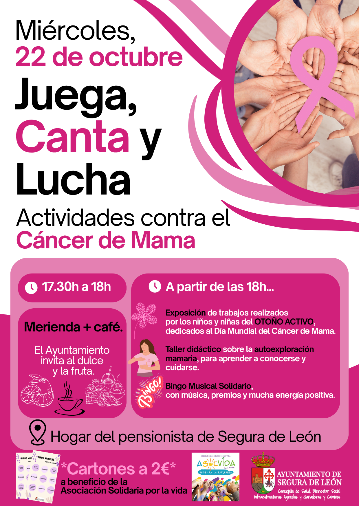 Cada 19 de octubre se celebra el Día Mundial del Cáncer de Mama, una fecha dedicada a concienciar sobre la prevención, la detección temprana y el apoyo a quienes luchan contra esta enfermedad. 💗 Desde el Ayuntamiento de Segura de León nos unimos a esta causa con una tarde solidaria llena de energía, aprendizaje y música.