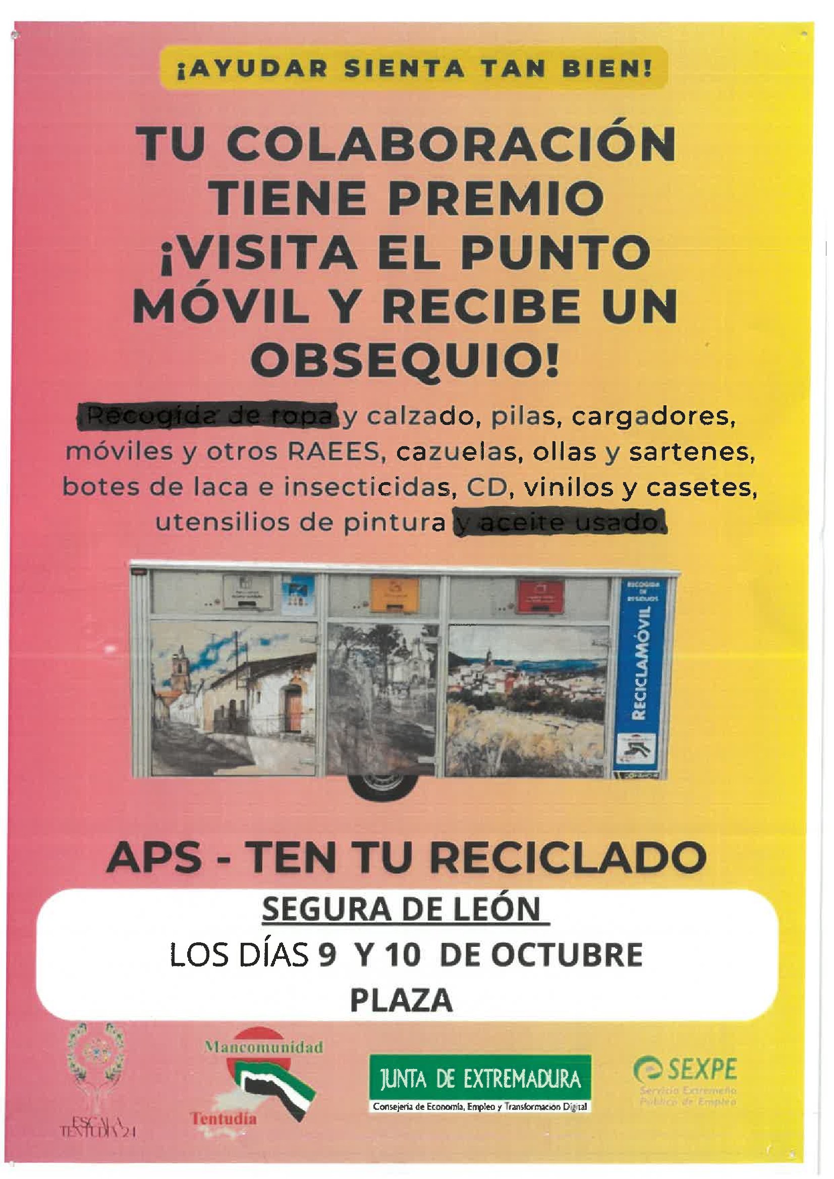 Aunque en algunos carteles anteriores aparecían indicados, NO SE RECOGERÁN ropa ni aceite usado en el punto limpio móvil que estará en Segura de León, los días 9 y 10 de octubre, en la Plaza.