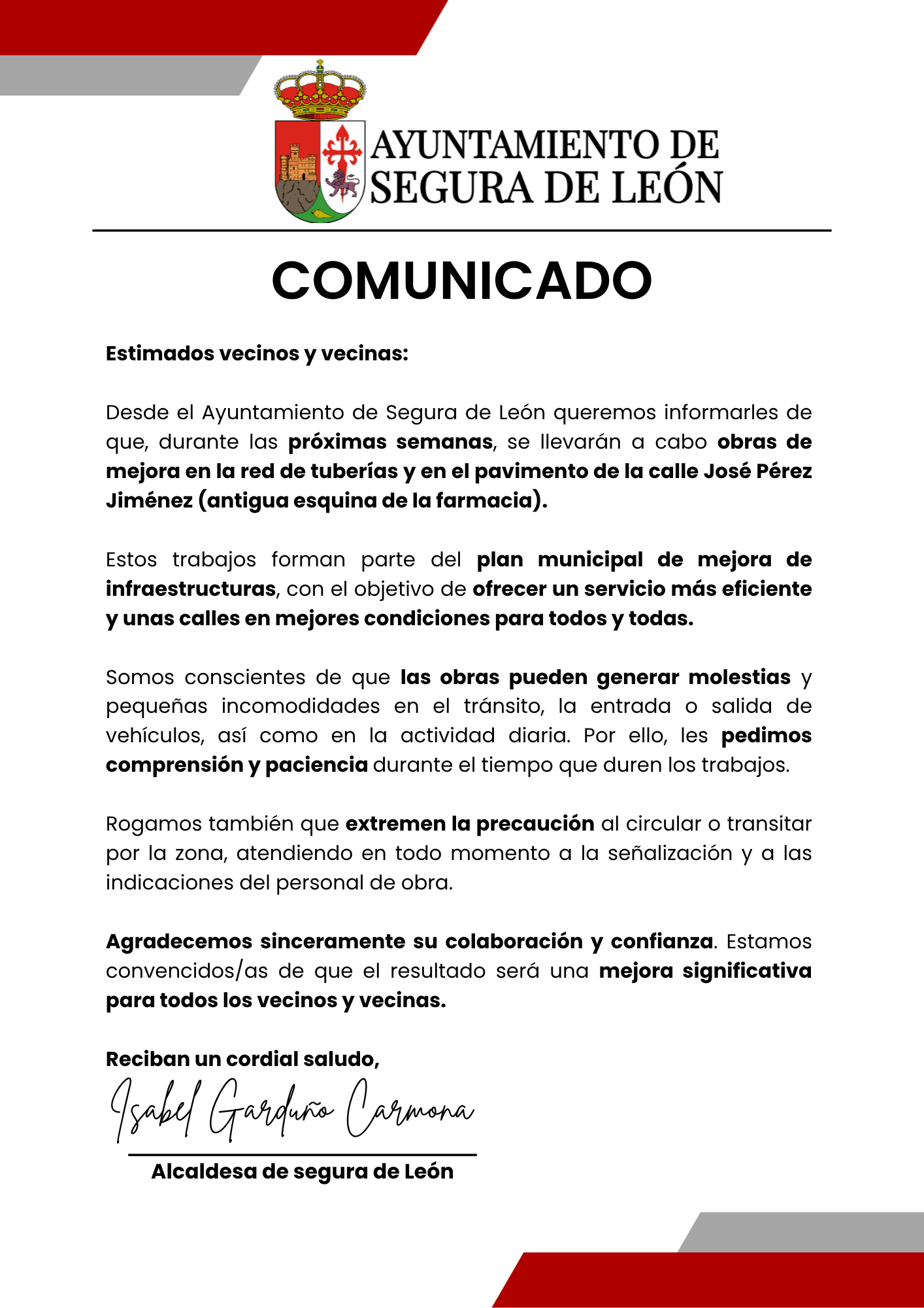 El Ayuntamiento de Segura de León, en coordinación con Aquanex y la Policía Local, informa a toda la ciudadanía de los siguientes trabajos que se van a llevar a cabo en la zona de la calle José Pérez Jiménez (antigua esquina de la farmacia):