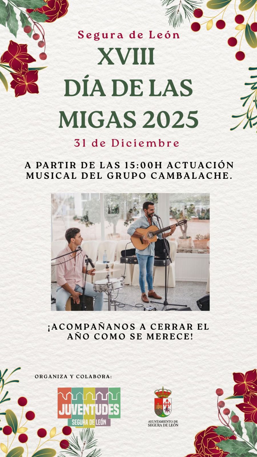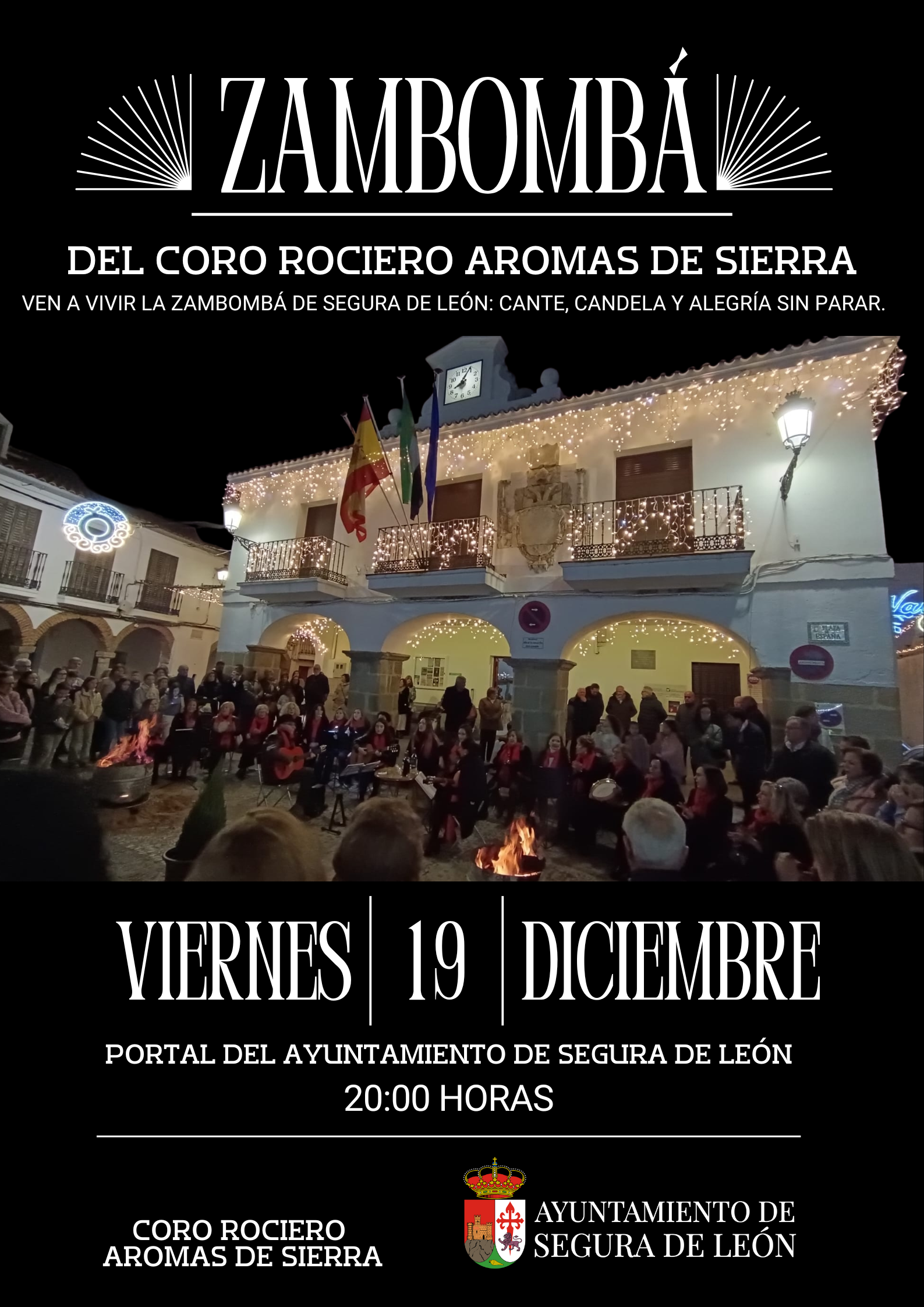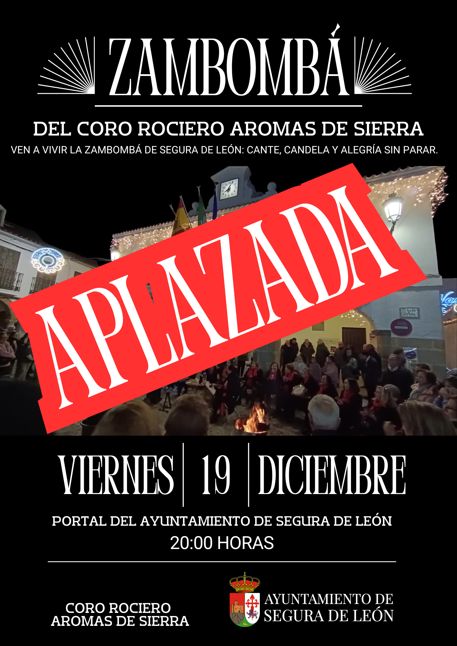 El Ayuntamiento de Segura de León informa que la Zambombá del Coro Rociero Aromas de Sierra, prevista para el viernes 19 de diciembre, queda aplazada debido a las previsiones meteorológicas adversas (lluvias).