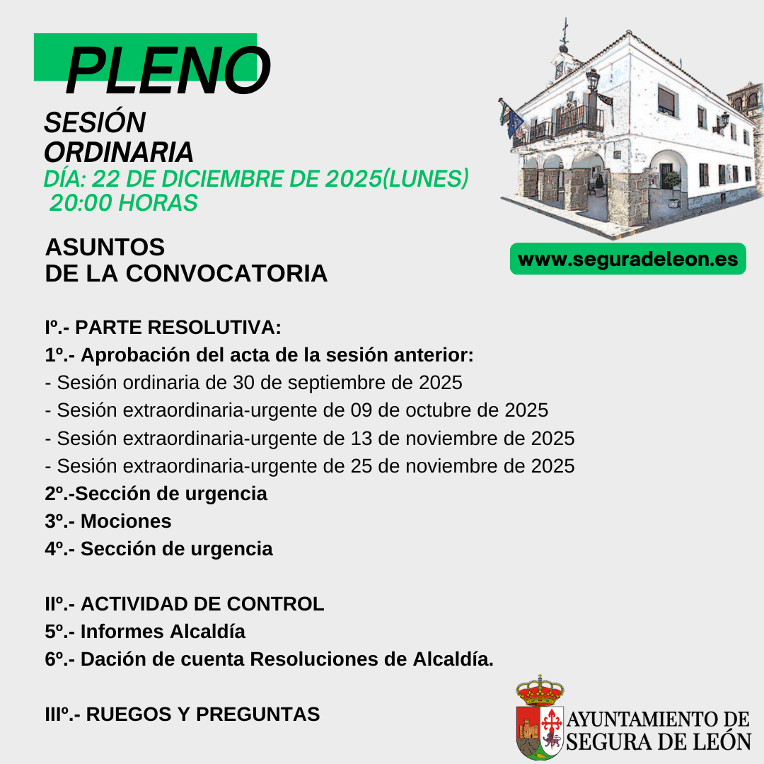 El Ayuntamiento de Segura de León celebrará Sesión Ordinaria del Pleno Municipal el próximo: