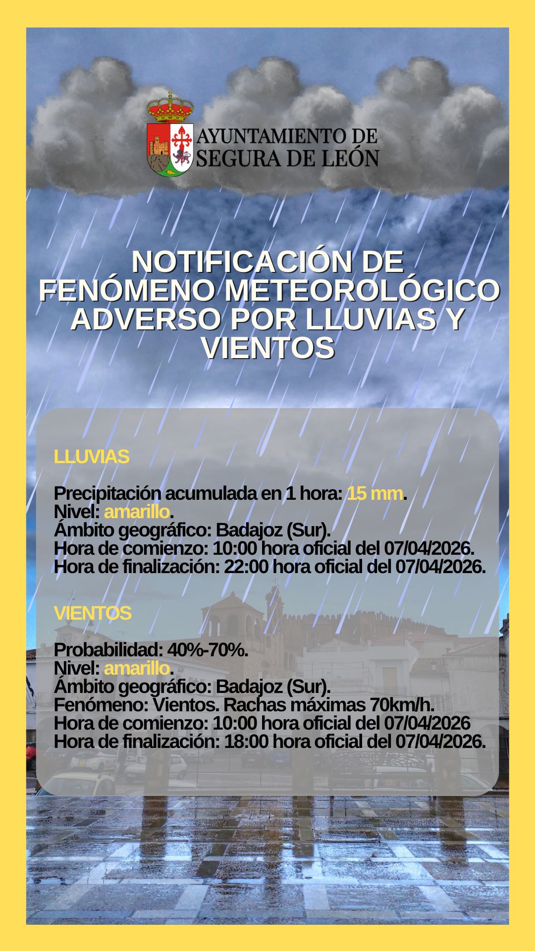 🟡AMPLIACIÓN DE ALERTA NIVEL AMARILLO por LLUVIAS, VIENTOS Y TORMENTAS para toda la Comunidad Autónoma de Extremadura, desde ahora hasta las 00:00 horas del día 8 de abril de 2026, por la probabilidad de que el FMA TORMENTAS, venga acompañado de fuertes rachas de viento, no descartándose la probabilidad de granizo.