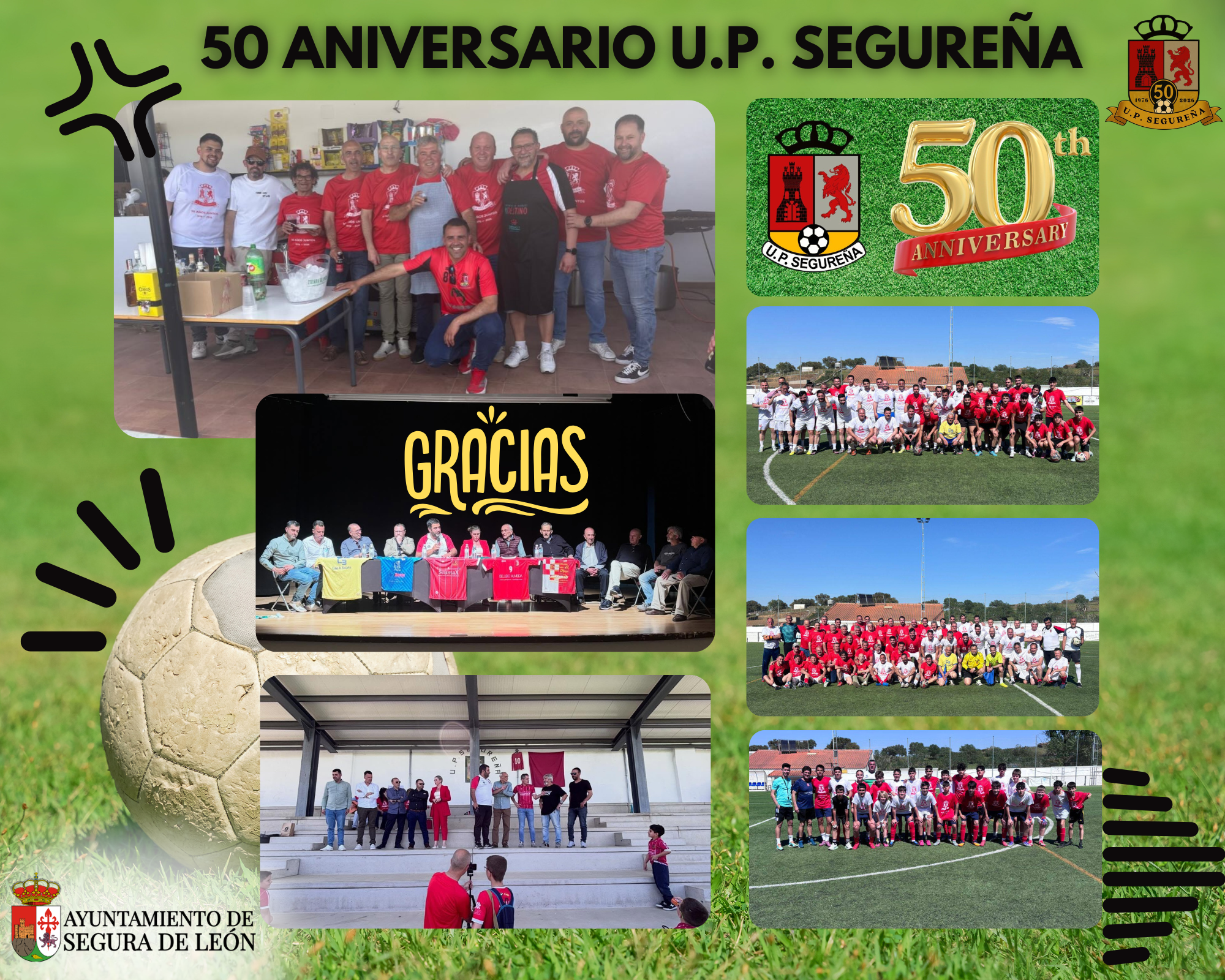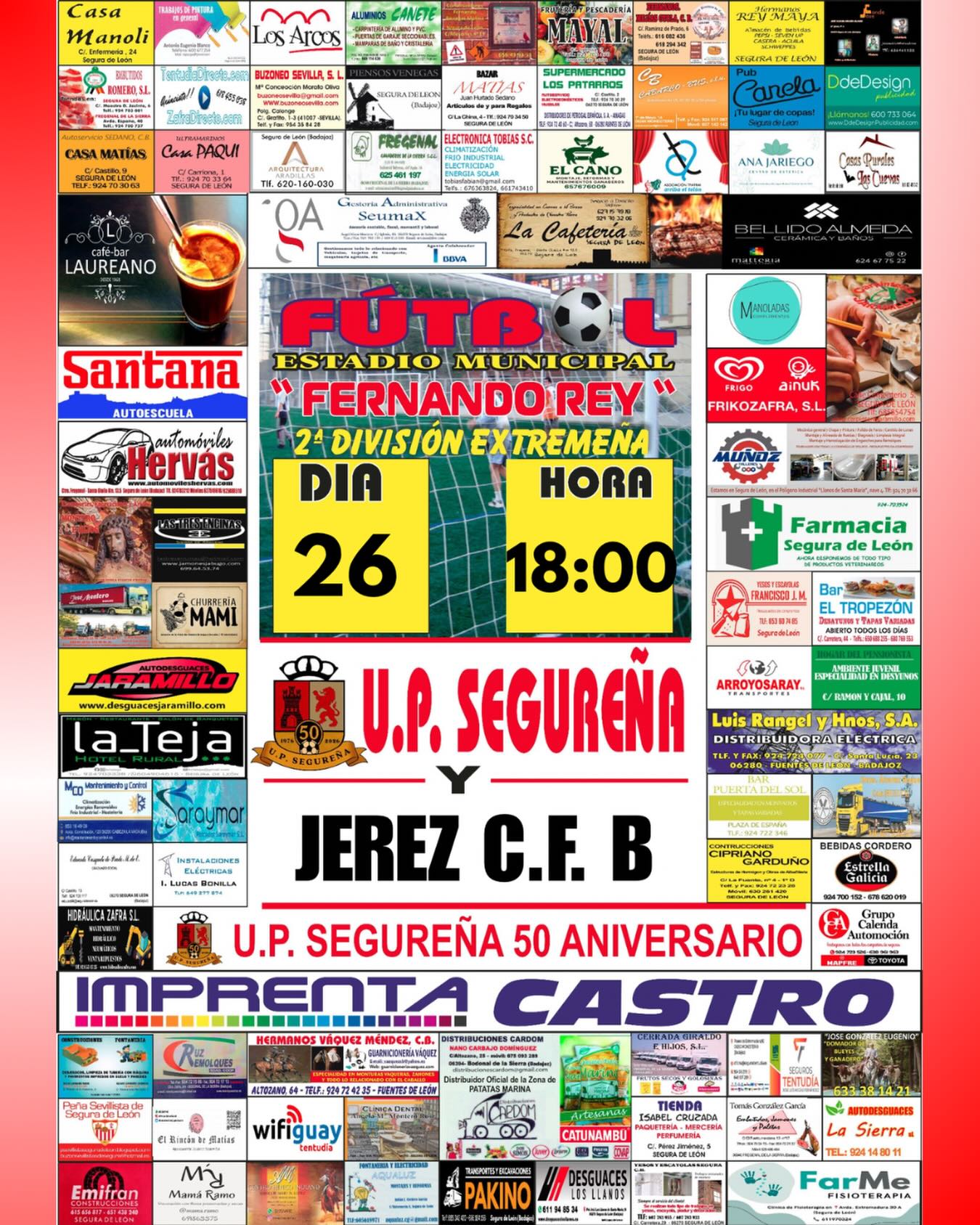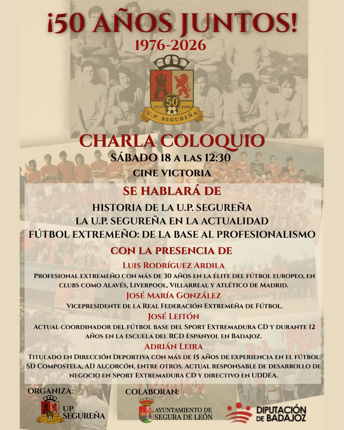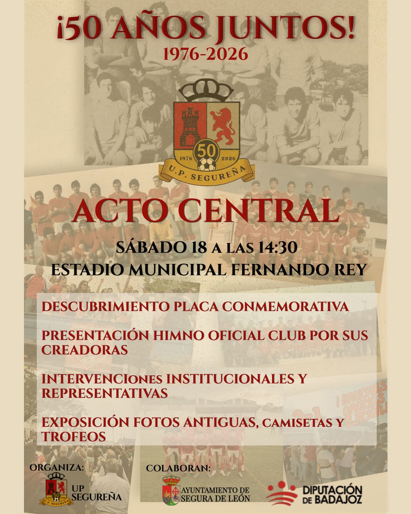 Desde el Ayuntamiento de Segura de León invitamos a todos los vecinos, vecinas y visitantes a disfrutar de una jornada muy especial con motivo del 50 aniversario de la U.P. Segureña, organizada por la U.P. Segureña con la colaboración de este Ayuntamiento y la Diputación de Badajoz.