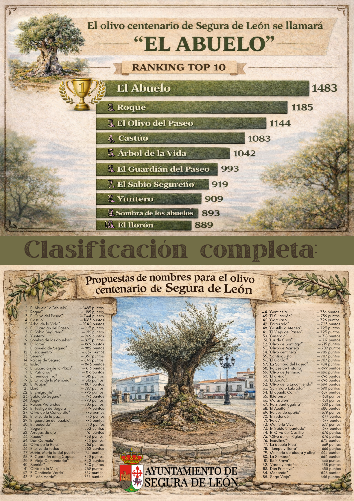 Gracias a vuestra participación, hemos recibido 85 propuestas y un total de 571 votos. Tras un emocionante recuento, el nombre elegido es: “El Abuelo”. 👵🫒
