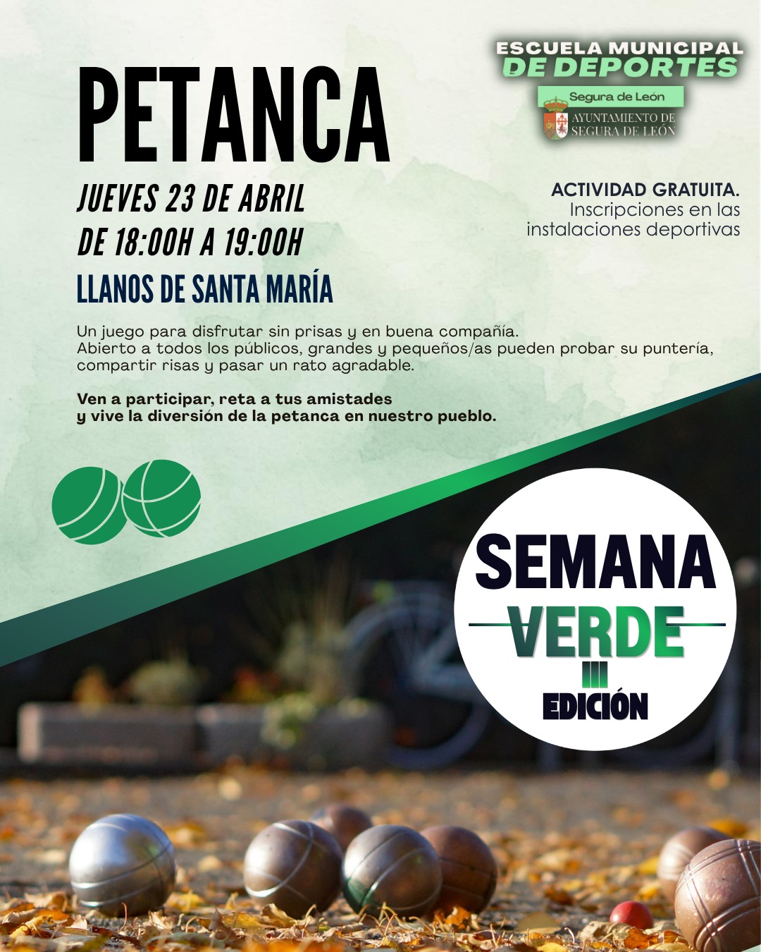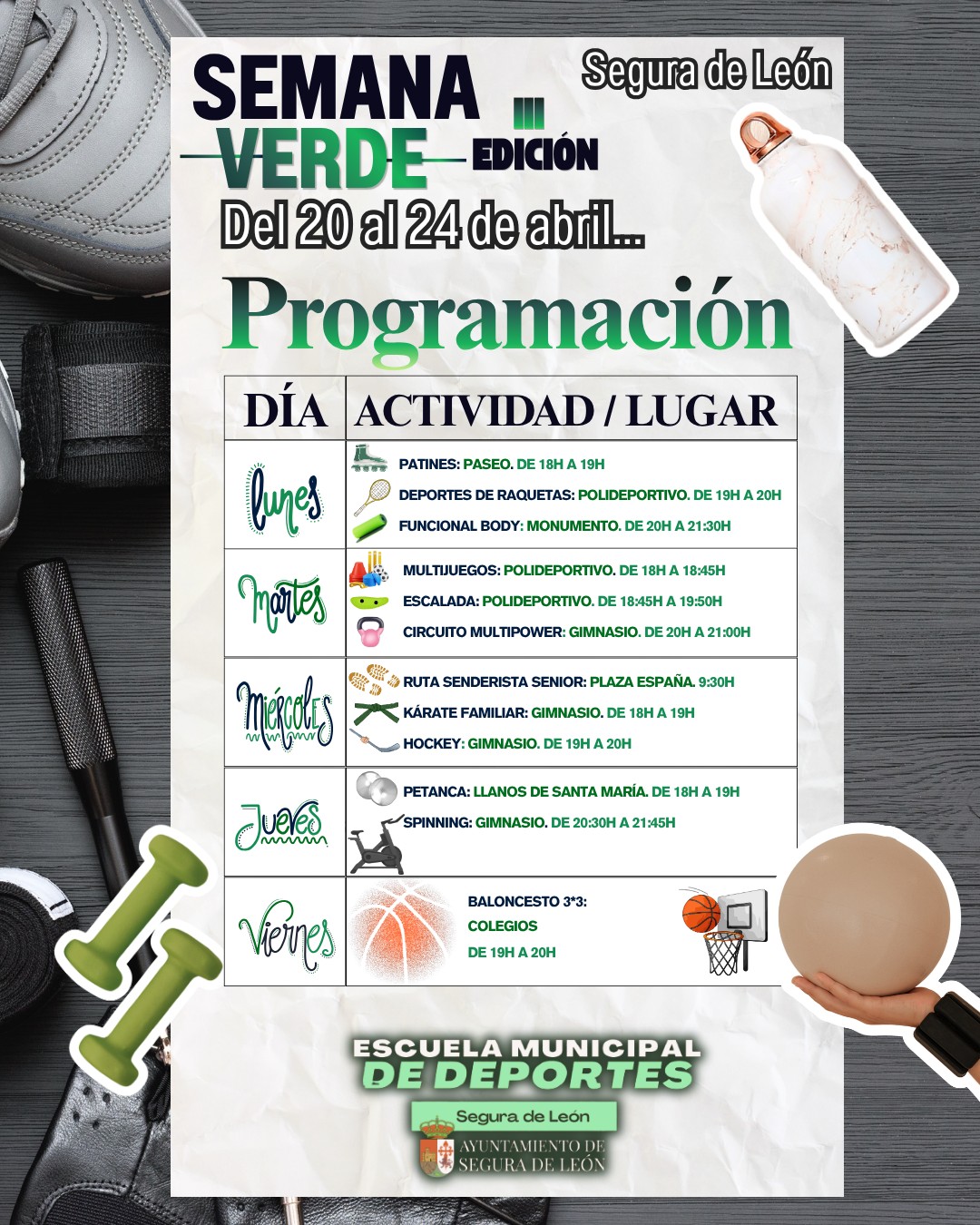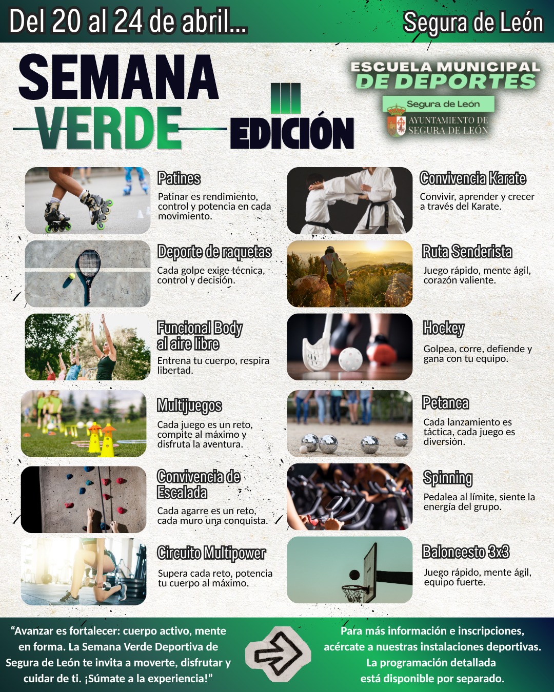 Desde la Escuela Deportiva del Ayuntamiento de Segura de León, hace unos días presentábamos una nueva edición de la Semana Verde Deportiva, una iniciativa pensada para fomentar hábitos saludables, disfrutar del deporte al aire libre y compartir grandes momentos en compañía.