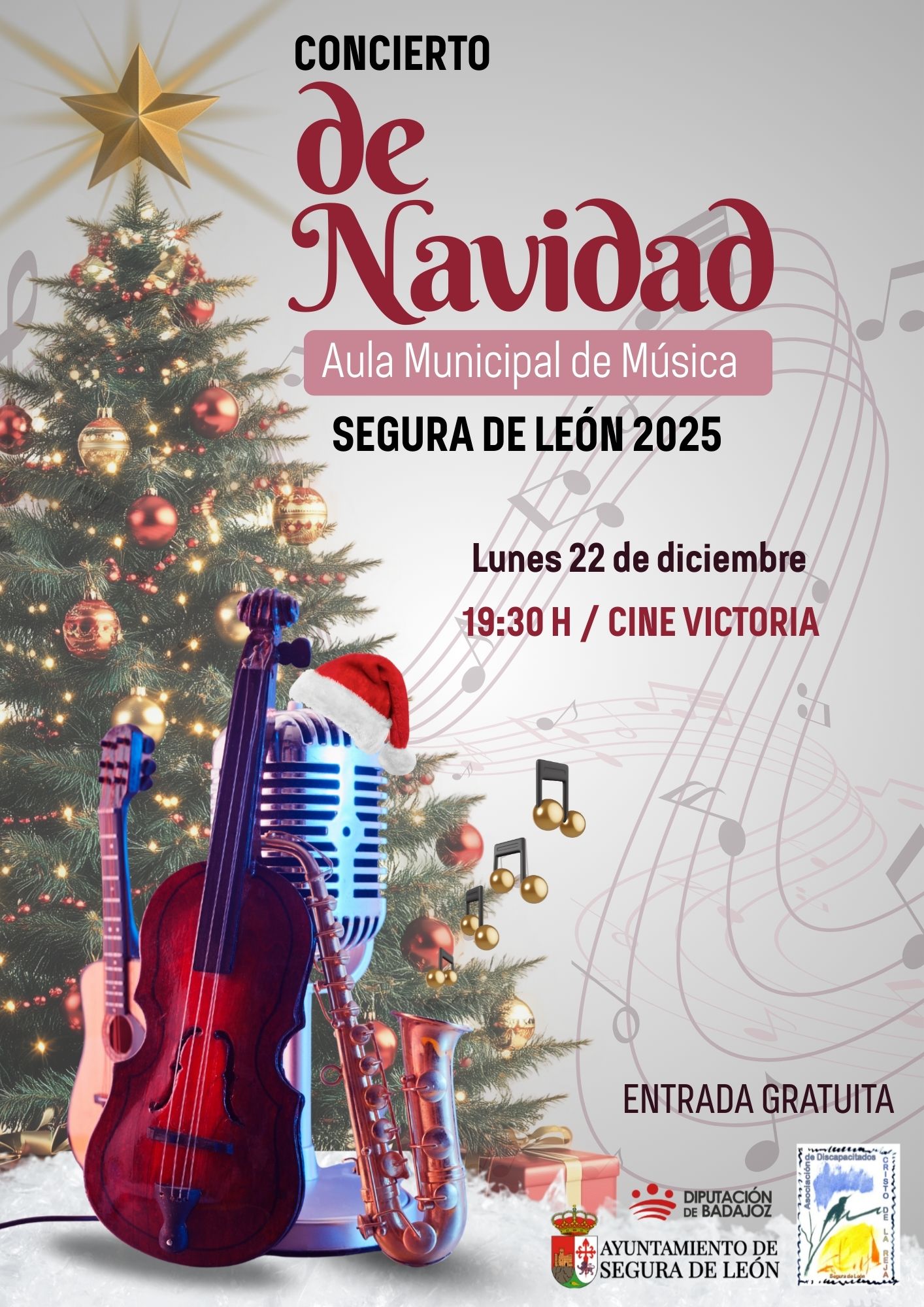 El Cine Victoria volvió a convertirse ayer en un punto de encuentro para la cultura y la música con la celebración del acto de clausura del Aula de Música de Segura de León. Una tarde muy especial en la que el escenario se llenó de ilusión, esfuerzo y ambiente navideño, compartida por alumnado, profesorado, familias y público en general.