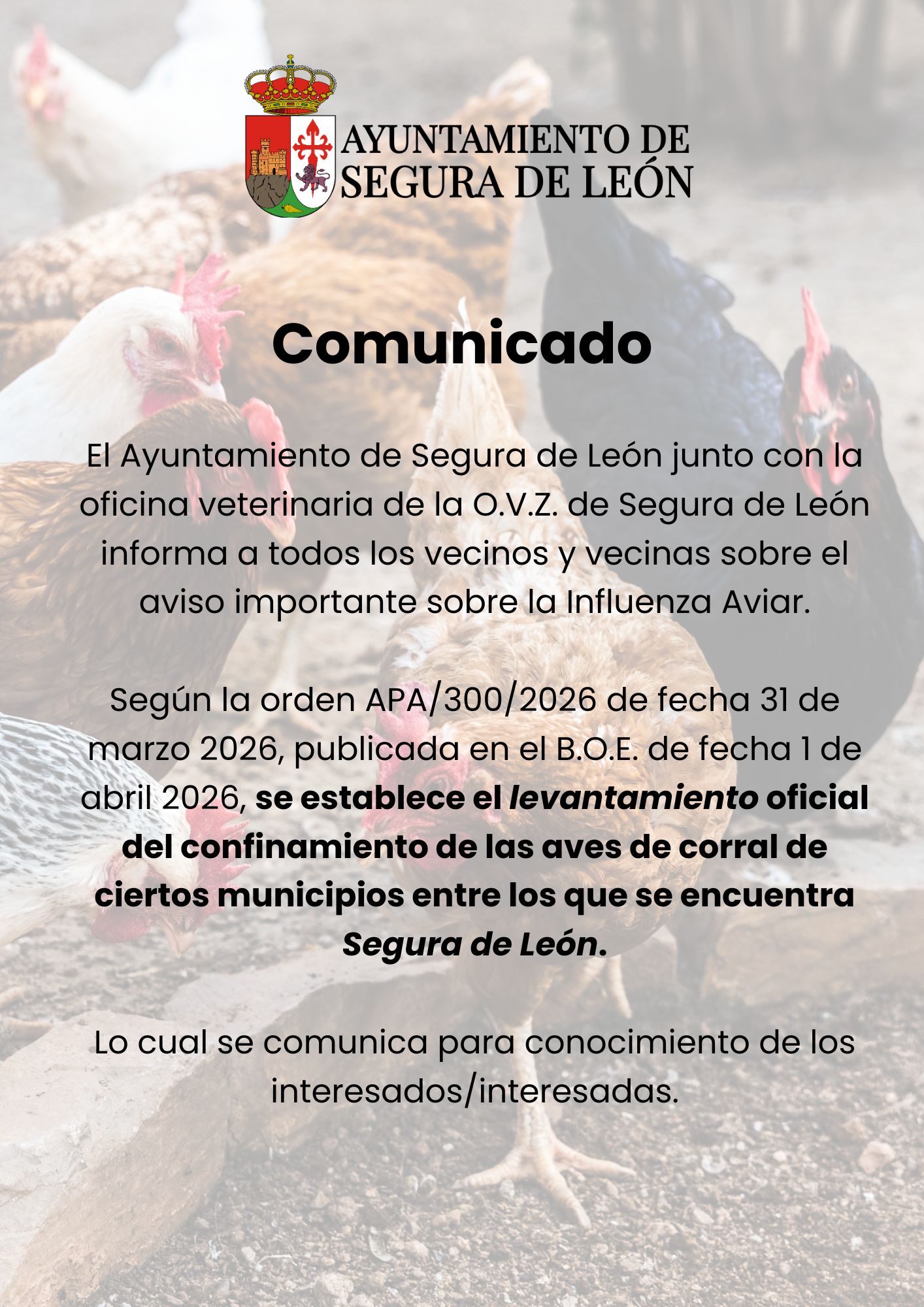 Según la orden APA/300/2026 de fecha 31 de marzo 2026, publicada en el B.O.E. de fecha 1 de abril 2026, se establece el levantamiento oficial del confinamiento de las aves de corral de ciertos municipios entre los que se encuentra Segura de León.
