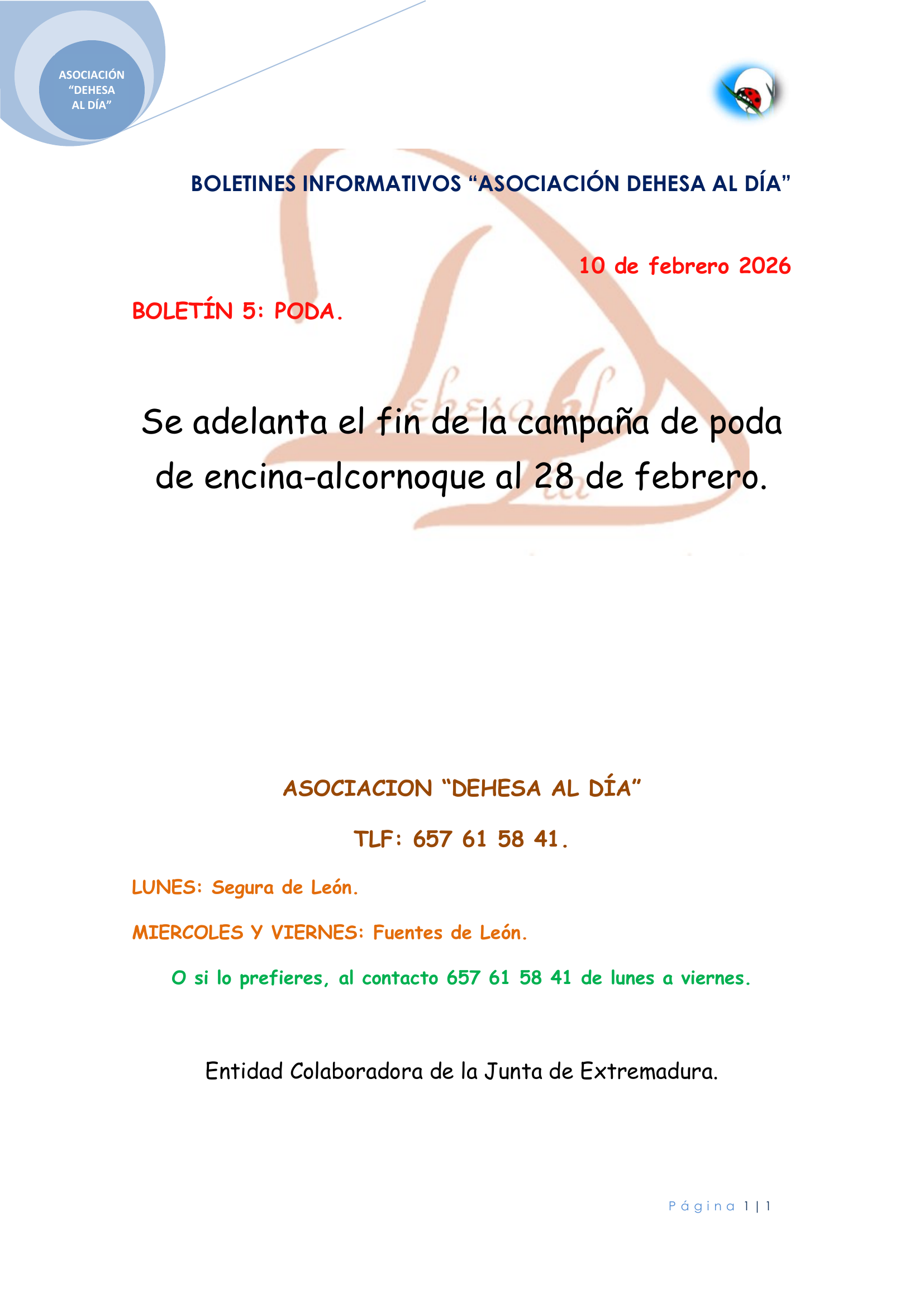 El Ayuntamiento de Segura de León informa, a través de la Asociación Dehesa al Día, de la publicación del Boletín nº 5 (10 de febrero de 2026):