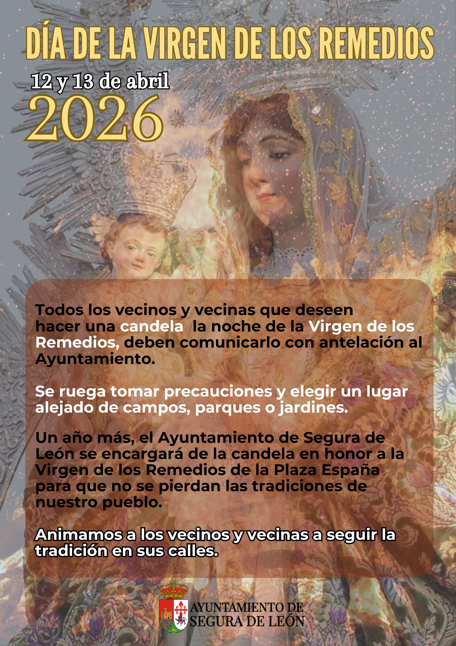 Con motivo de la festividad de la Virgen de los Remedios, se informa a todos los vecinos y vecinas que deseen hacer una candela la noche de la Virgen de los Remedios (12 de abril), deben comunicarlo con antelación al Ayuntamiento.