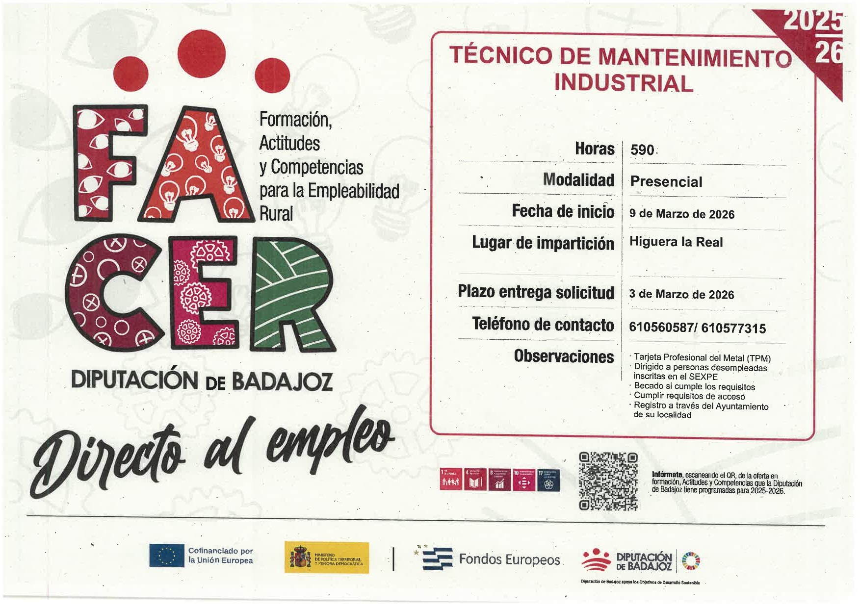 La Diputación de Badajoz lanza el curso TÉCNICO DE MANTENIMIENTO INDUSTRIAL dentro del programa FA-CER (Formación, Actitudes y Competencias para la Empleabilidad Rural).