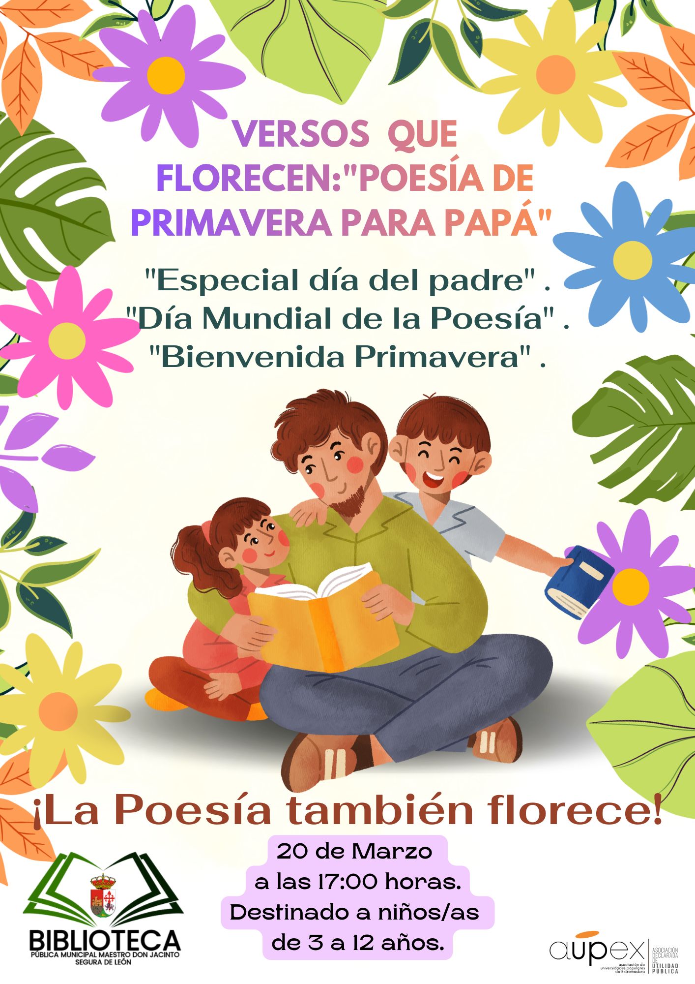 Desde la Biblioteca Pública Municipal de Segura de León Maestro Don Jacinto invitamos a niños y niñas de 3 a 12 años a participar en Versos que florecen: "Poesía de primavera para papá”, una actividad especial donde podrán crear pequeños versos y dedicarle una poesía llena de cariño a papá.