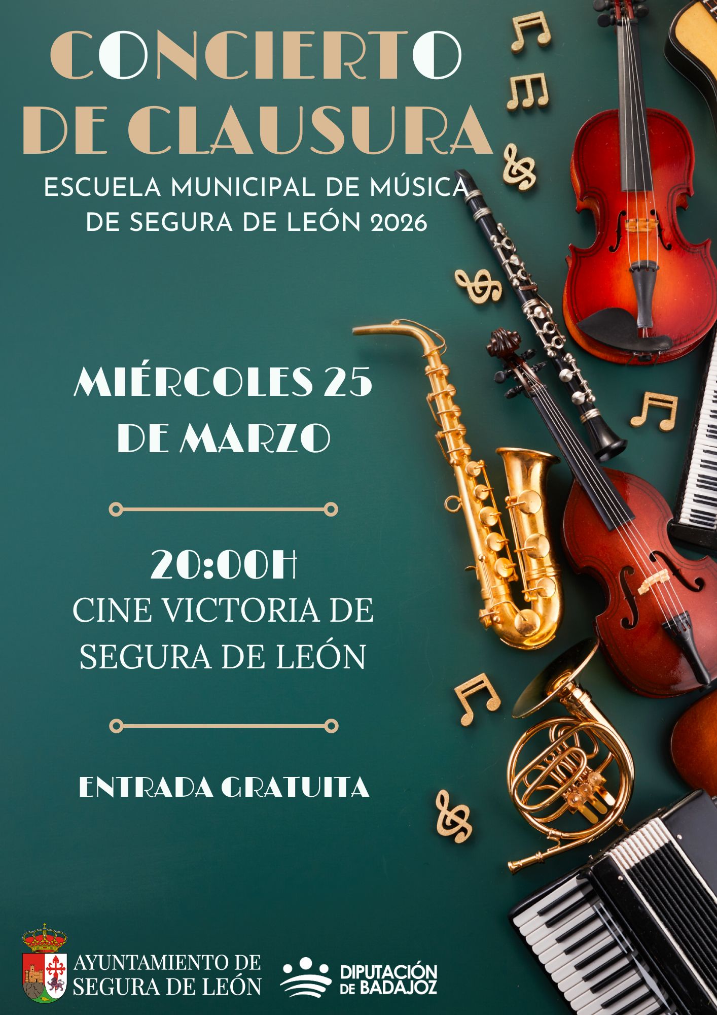 Te invitamos al Concierto de Clausura de la Escuela Municipal de Música de Segura de León 2026, una cita muy especial donde el talento, la pasión y el esfuerzo de todo un curso se transforman en música.