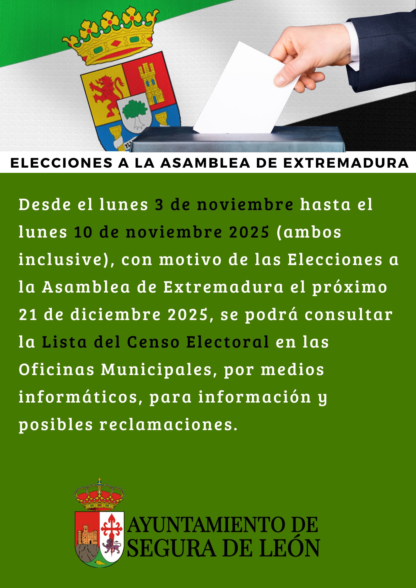 CONSULTA LISTA DEL CENSO ELECTORAL2025-10-30 10:31:02Info GeneralDesde el lunes 3 de noviembre hasta el lunes 10 de noviembre 2025 (ambos inclusive), con motivo de las Elecciones a la Asamblea de Extremadura el próximo 21 de diciembre 2025, se podrá consultar la Lista del Censo Electoral en las Oficinas Municipales, por medios informáticos, para información y posibles reclamaciones.