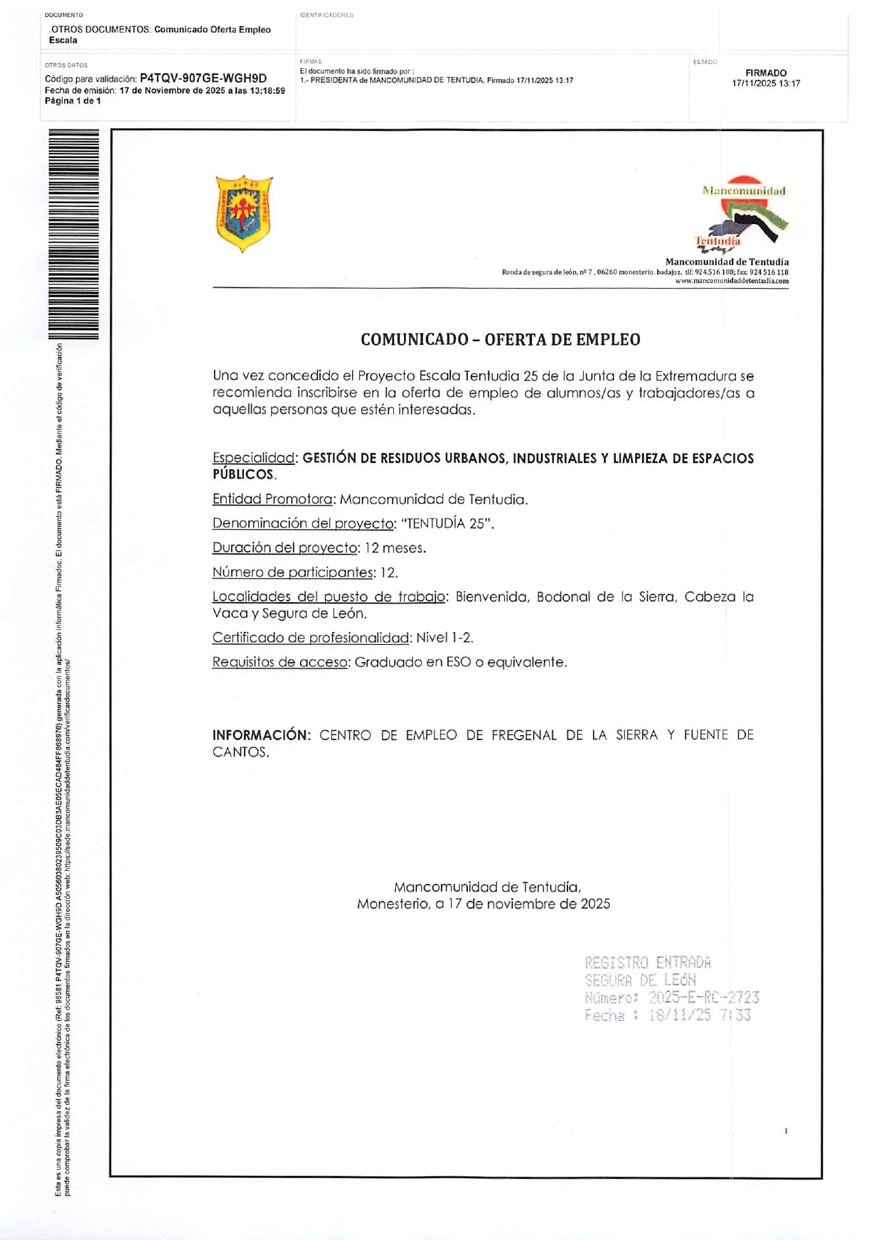 📣 OFERTA DE EMPLEO – PROYECTO “TENTUDÍA 25”2025-11-18 12:45:50EmpleoLa Junta de Extremadura ha concedido el Proyecto Escala Tentudía 25, y desde la Mancomunidad de Tentudía se invita a todas las personas interesadas a inscribirse en esta nueva oferta formativa y laboral.