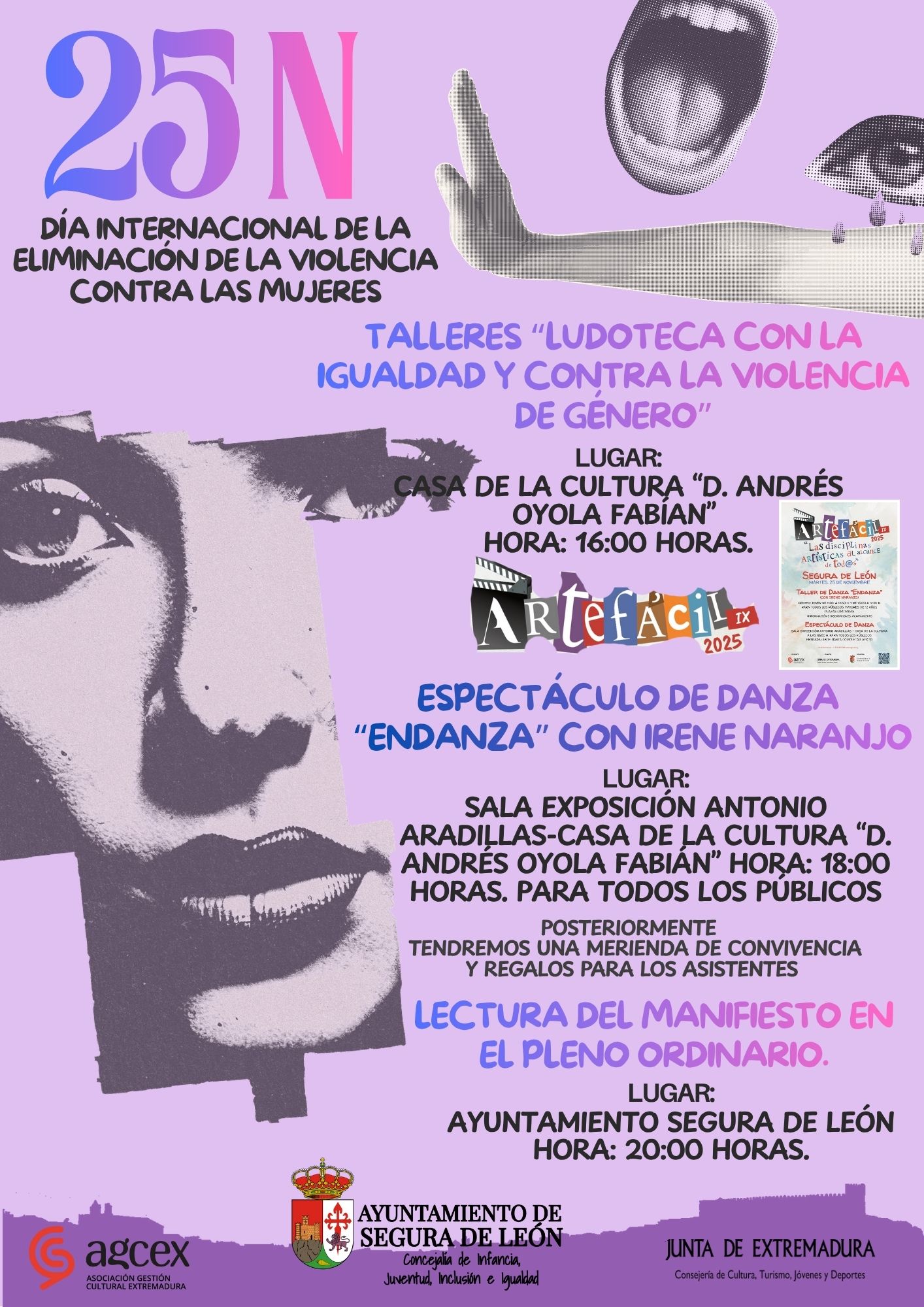 💜 💜Este 25 de noviembre nos unimos para decir #NoALaViolenciaContraLasMujeres. Desde el Ayuntamiento de Segura de León te invitan a participar en actividades para visibilizar, acompañar y construir una sociedad más justa e igualitaria: