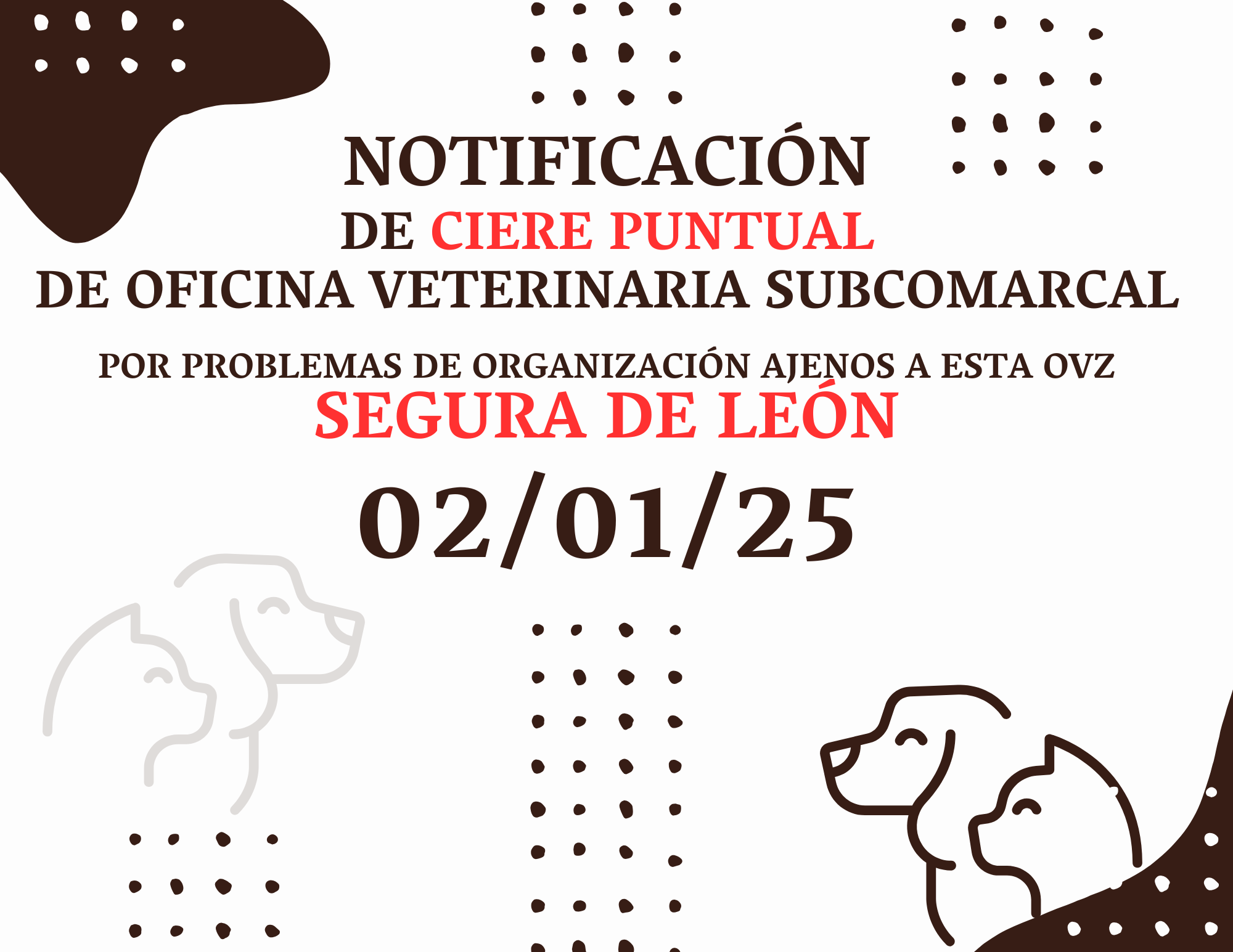 Desde la Oficina Veterinaria de Zona (O.V.Z.) nos informan de un cierre puntual el día 2 de enero.